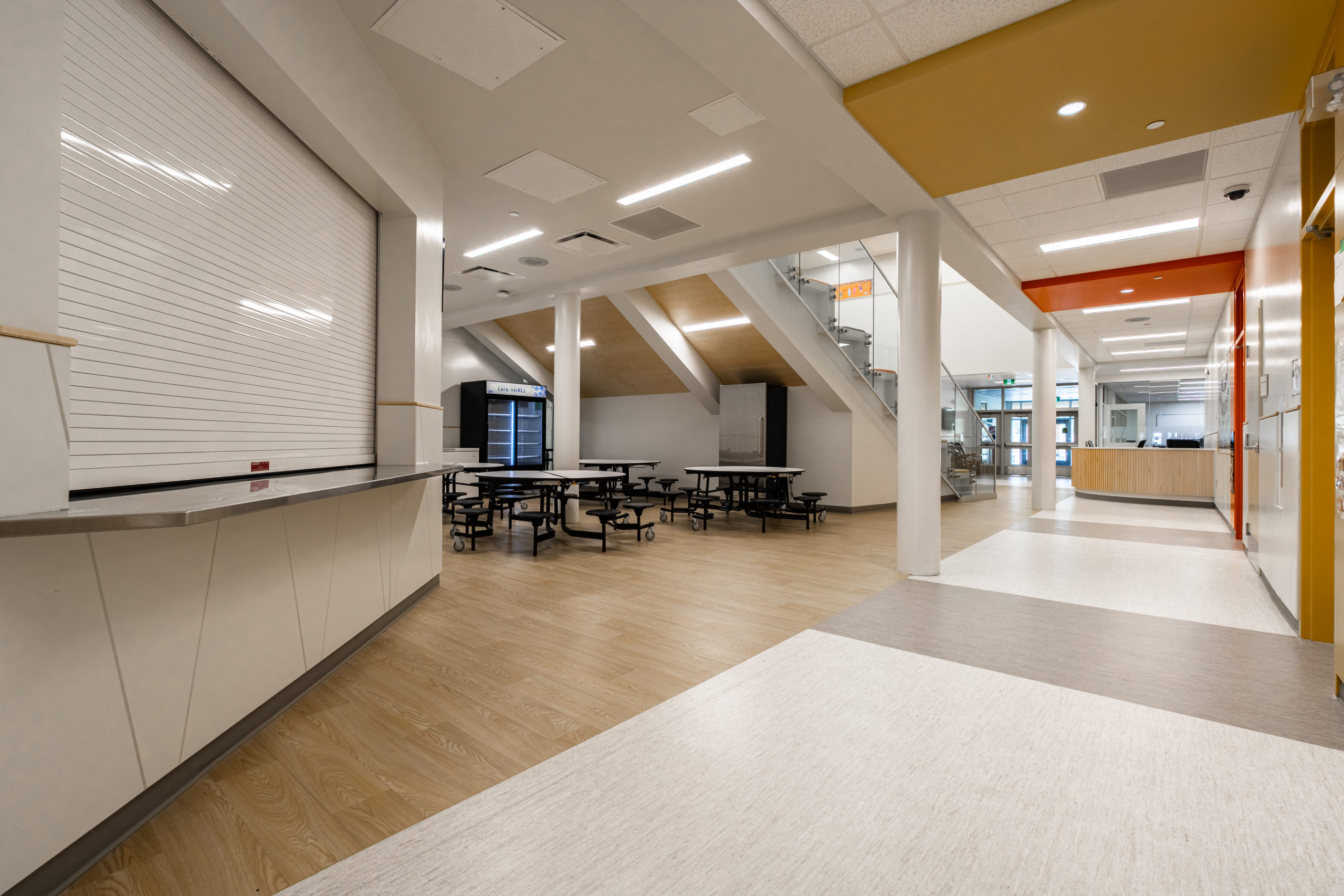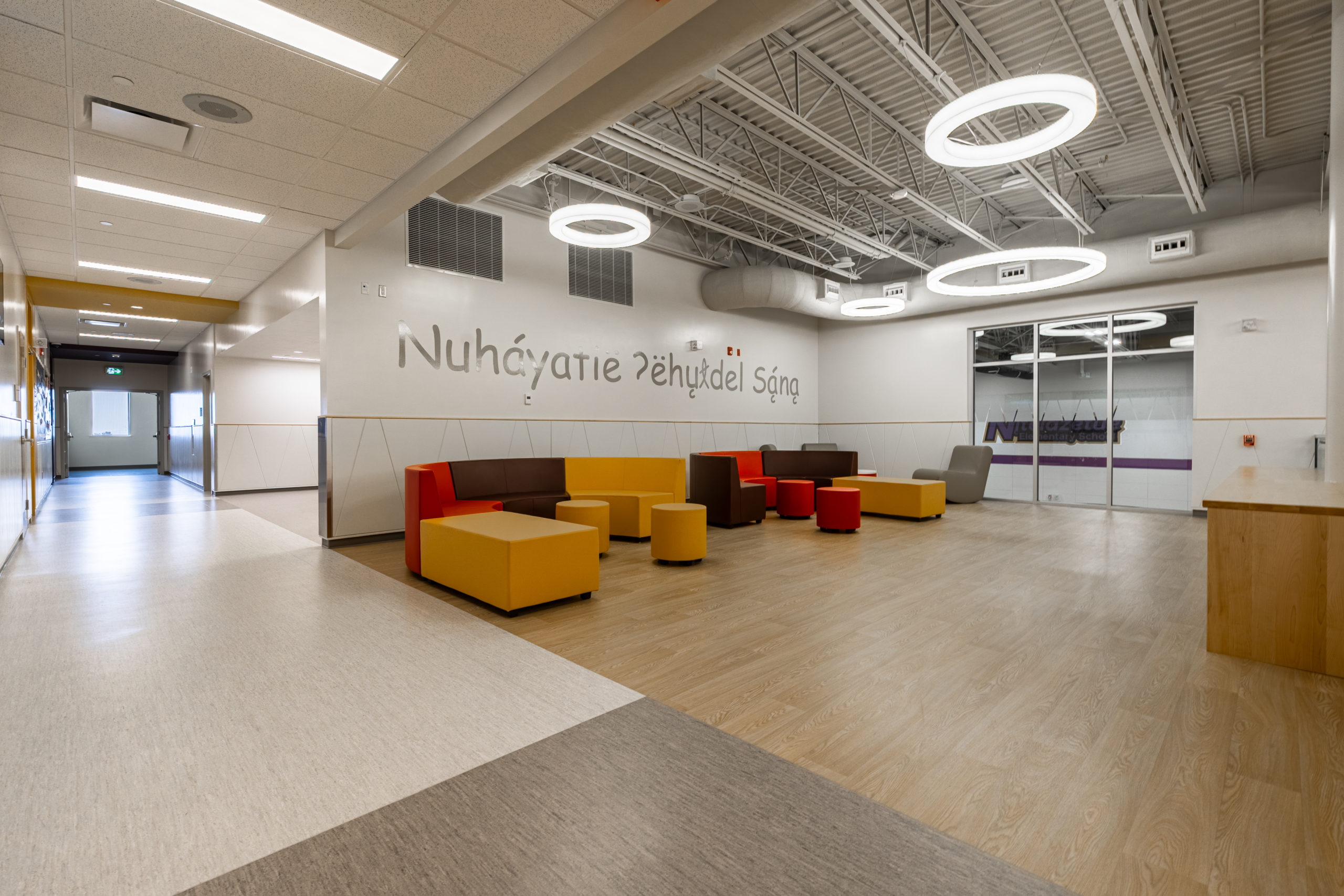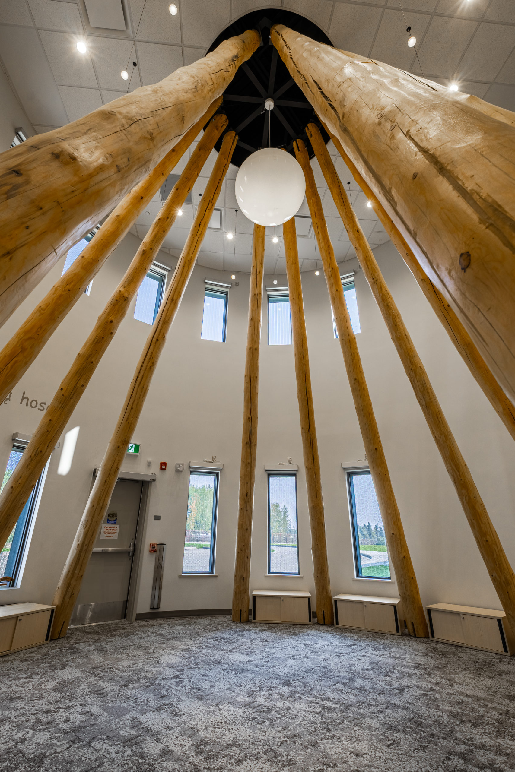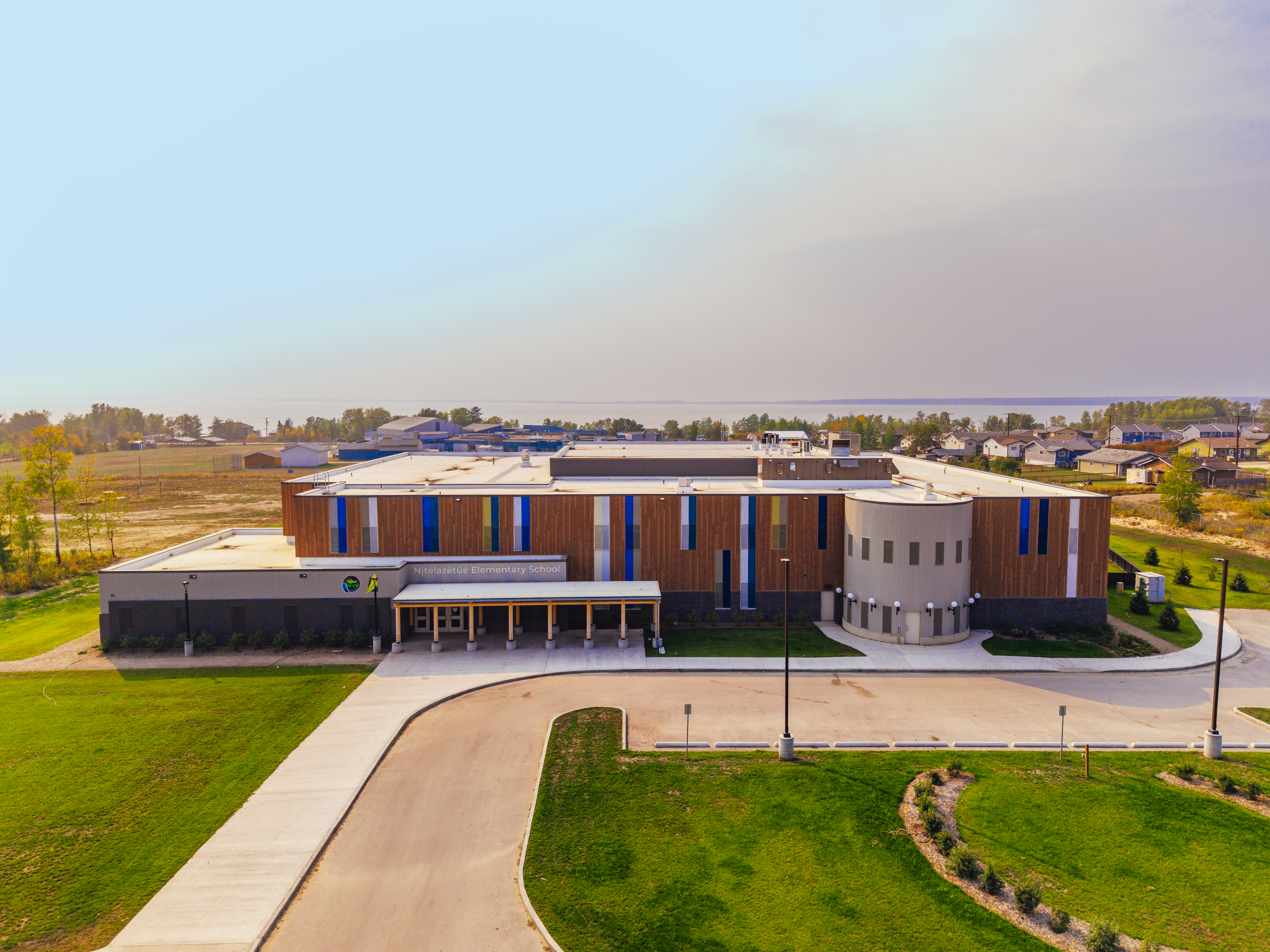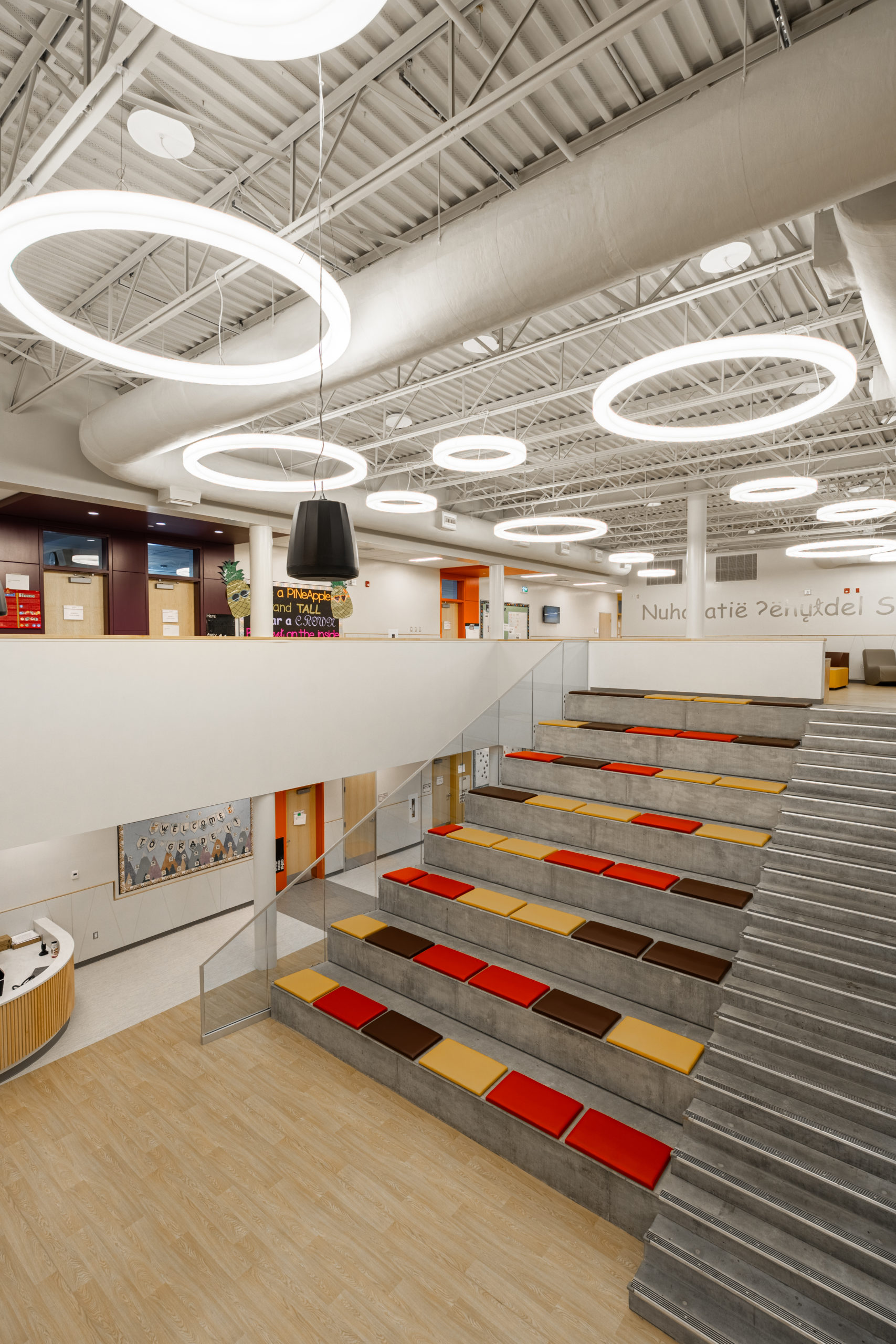The project was completed two months ahead of schedule, delivering a 59,700sf. facility for nearly 500 students from Pre-Kindergarten to Grade 6. The design incorporates Indigenous cultural elements, including a rounded cultural centre for ceremonies and community gatherings, with features that reflect both heritage and the natural environment. The school includes 26 classrooms, a kitchen for the student meal program, and a central staircase designed as both a circulation hub and gathering space.